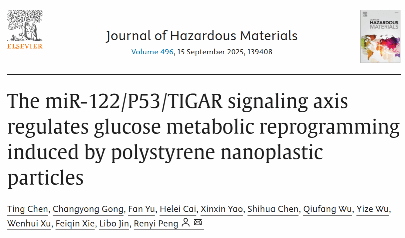 近日,万象城手机网页版登录入口生命与环境科学学院彭仁义课题组在中科院一区期刊《Journal of Hazardous Materials》(IF=11.3)发表了题为“The miRNA-122/P53/TIGAR signaling axis regulates glucose metabolic reprogramming induced by polystyrene nanoplastic particles”最新研究。该研究聚焦聚苯乙烯纳米塑料(PS-NPs)污染这一全球性威胁,深入探究其通过靶向miRNA-122对糖代谢重编程的复杂影响机制。