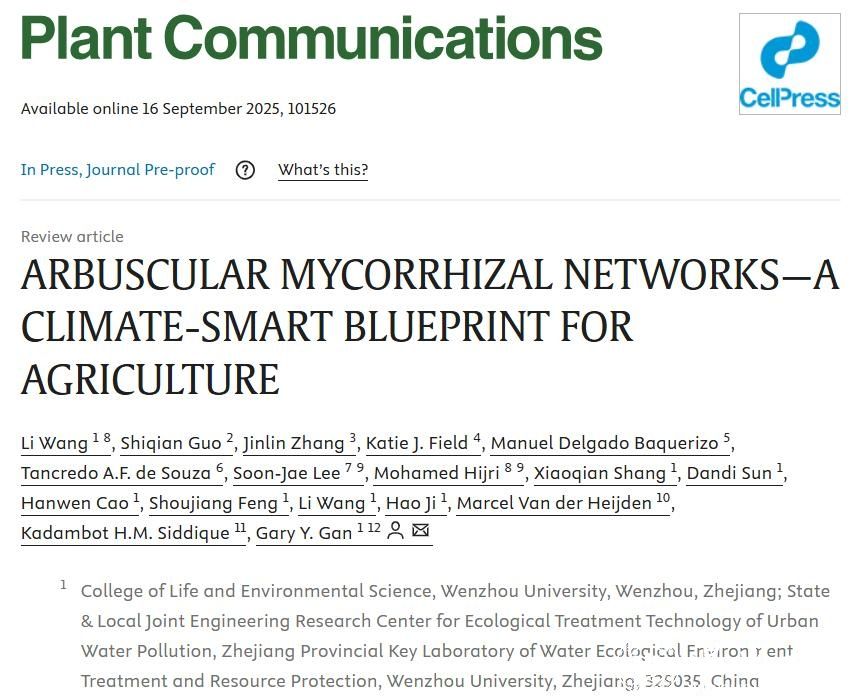 近日,万象城手机网页版登录入口生命与环境科学学院甘延太团队联合国际多所高校科研人员,在Cell Press期刊《Plant Communications》(中科院一区TOP,影响因子11.4)发表题为 “Arbuscular mycorrhizal networks — a climate - smart blueprint for agriculture”的论文,该研究系统阐述了丛枝菌根真菌(AMF)在提升农业生态系统韧性、减少化学投入、增强土壤健康等方面的多重功能,并提出以AMF为重要因子的“微生物驱动型农业”新模式,为全球可持续生态农业提供了理论依据与技术蓝图。