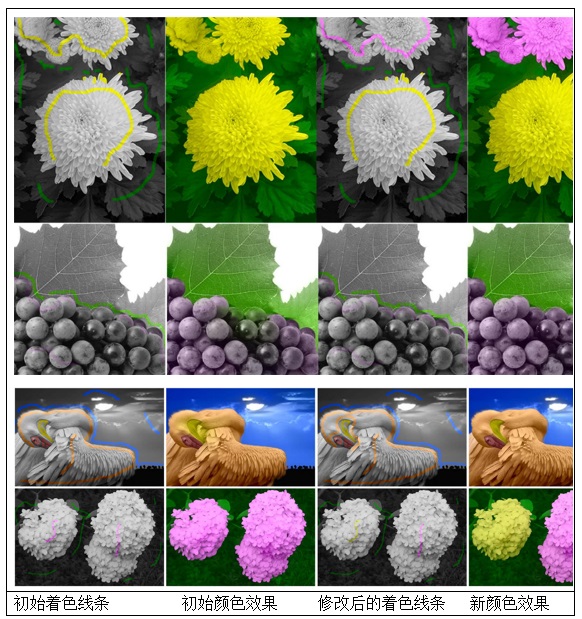 众所周知,由于运行功率和发热量等因素的约束,当前电脑CPU很难在主频上有较大的提高,因此CPU主要是往双核、四核乃至更多处理核心的方向发展。显卡GPU原先只能做专门的图形运算,如今发展到能够做通用的并行算术逻辑运算。相比于仅拥有数个处理核心的CPU,显卡GPU则拥有数千个并行处理核心,其发展速度已经远快于CPU发展的摩尔定律,适合于数据密集型的并行计算。为了减少图像颜色编辑软件的响应时间,改善用户的交互体验,将显卡GPU作为CPU的并行协处理器,使得原先需要数十秒钟才能计算完成的颜色优化算法加速到一秒钟之内即可完成。因此,近实时的算法处理效率极大地便利了用户的编辑交互。如下图所示,用户可以很方便地通过添加着色线条、擦除线条、修改线条颜色等编辑操作即时地生成各种不同的颜色效果。