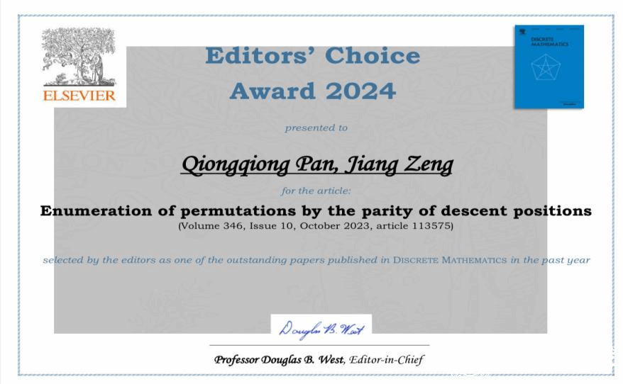 近日,我校数学学院潘琼琼博士以及法国里昂第一大学曾江教授的科研成果“Enumeration of permutations by the parity of descent positions”被《Discrete Mathematics 》(DM)期刊入选为“Editors’ Choice Award 2024”(由期刊主编从期刊中一大批高质量论文中选出,并由专门的评审委员会评判并赞扬其高影响力,并在DM期刊的社交媒体渠道对该文章进行宣传),目前该文章在https://doi.org/10.1016/j.disc.2023.113575上免费对读者开放至2025年3月31日。