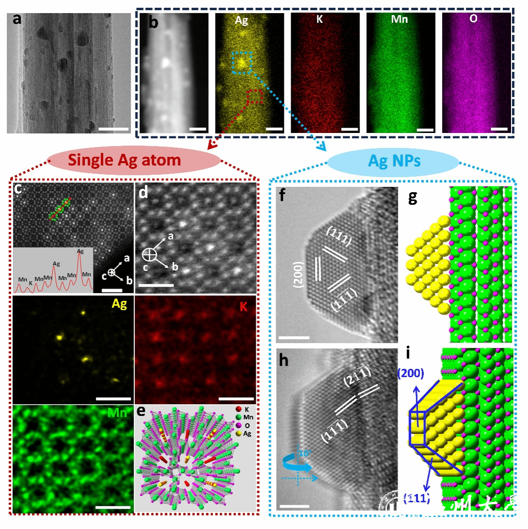 近日,我校王舜/袁一斐/吕晶晶教授课题组在国际顶级期刊《Advanced Materials》发表题为“Seeding Atomic Silver into Internal Lattice Sites of Transition Metal Oxide for Advanced Electrocatalysis”的论文。该工作利用隧道结构的α-MnO2作为基底,将Ag原子链引入α-MnO2隧道内部,并且在MnO2表面通过共享晶格外延生长负载了Ag纳米颗粒,从而制备了双位点Ag催化剂。通过开发过渡金属氧化物晶格内部的催化剂负载位点,可以大大增加基底的催化活性中心,提高电催化二氧化碳还原的效率,并且隧道内部的催化剂由于金属离子-基底间的协同作用,导致其中间反应过程中的能垒显著降低。更重要的是,MnO2对内外的Ag催化剂物种均具有很强的约束作用,可以抑制Ag的团聚,从而提高催化剂的循环寿命。