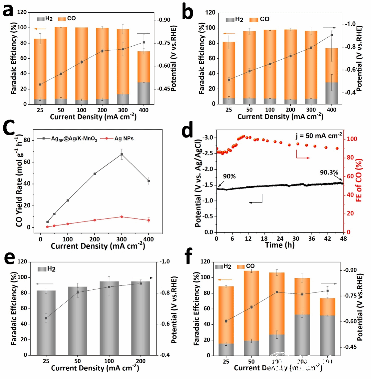 基于此,在碱性流动池中测试eCO2RR性能,AgNP@Ag/K-MnO2催化剂表现出高选择性(法拉第效率94%)、产率(67.3 mol/g/h)、部分电流密度270 mA/cm2和长期耐久性(在50 mA/cm2下约48小时),超过了商业Ag纳米颗粒(Ag NPs)和目前报道的大多数Ag电催化剂。本研究结果阐明了用于eCO2RR的先进催化剂的关键结构-性能关系。我们也期望它能够激发未来基于TMOs的催化剂的先进设计,考虑利用其内部晶格空间以最大程度地提高催化活性位点,而不是仅仅只局限在基底的表面位点。