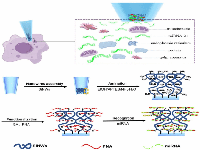 图1. SiNWs@GMT传感器用于超灵敏检测miRNA-21的示意图