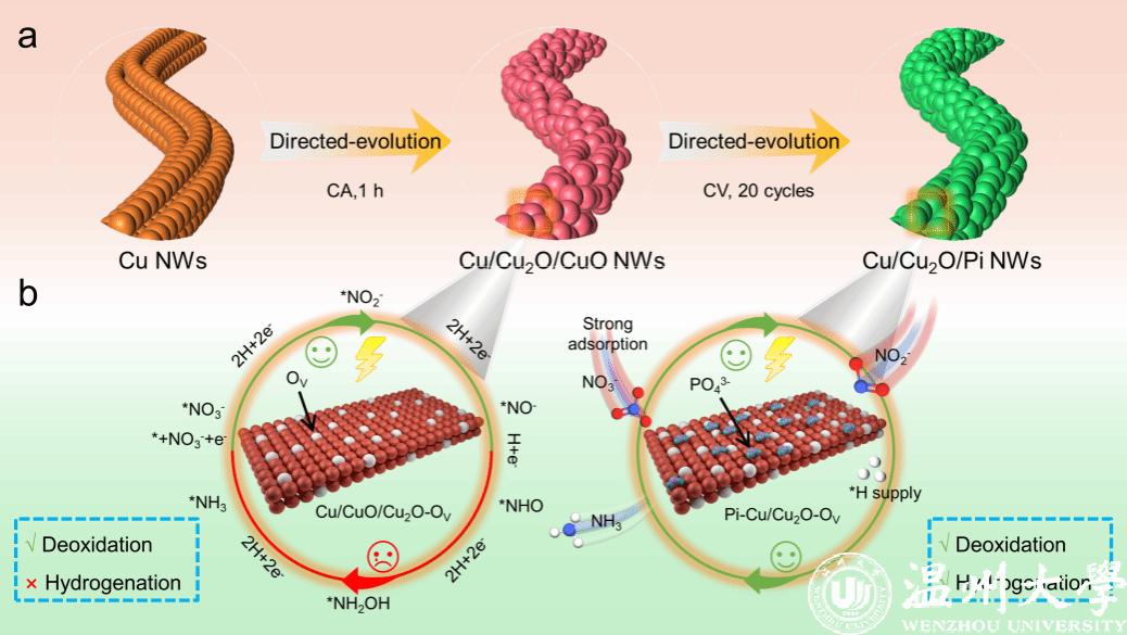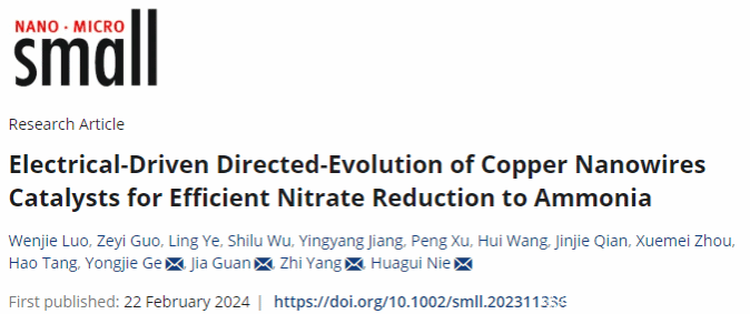 相关研究成果以《Electrical-Driven Directed-Evolution of Copper Nanowires Catalysts for Efficient Nitrate Reduction to Ammonia》为题发表在国际著名期刊《Small》(IF:13.3)上。万象城手机网页版登录入口2020级研究生罗文杰和2022级研究生郭泽佚为第一作者,我院杨植教授、聂华贵教授、葛勇杰副研究员和贯佳副教授为共同通讯作者。