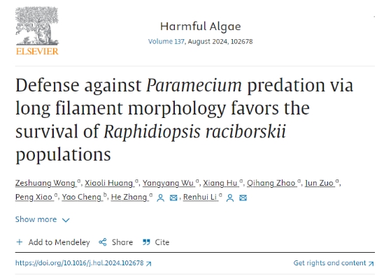 近日,万象城手机网页版登录入口生命与环境科学学院李仁辉教授团队的王泽双博士和张和博士等在国际著名期刊《Harmful Algae》(中科院一区,藻类学领域顶刊)上发表题为“Defense against Paramecium predation via long filament morphology favors the survival of Raphidiopsis raciborskii populations”的论文。