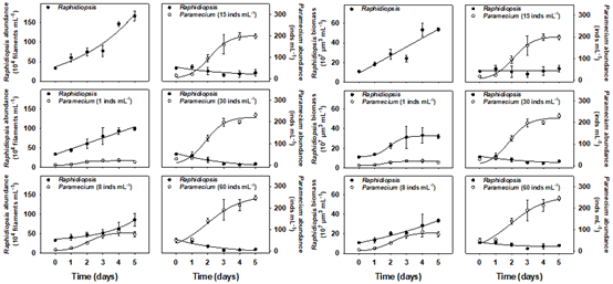 新型蓝藻水华--尖头藻(Raphidiopsis)水华因其产生蓝藻毒素和强大的入侵性而臭名昭著,并威胁着水域生态系统的稳定和人类的健康。原生动物草履虫因其强大的摄食能力而可以作为控制尖头藻水华的潜在生物。然而,草履虫的摄食能力却很大程度上取决于被捕食者的体积。同时,尖头藻种群由不同长度(或体积)的尖头藻藻丝组成。草履虫是否更倾向于捕食尖头藻种群中长度较短或体积较小的藻丝,并排斥那些较长的尖头藻藻丝至今仍不得而知。因此,本研究针对这一科学问题,对不同初始密度的捕食者草履虫(Paramecium sp.)和猎物拉氏尖头藻(Raphidiopsis raciborskii)进行共培养实验,以期解决这一科学问题。