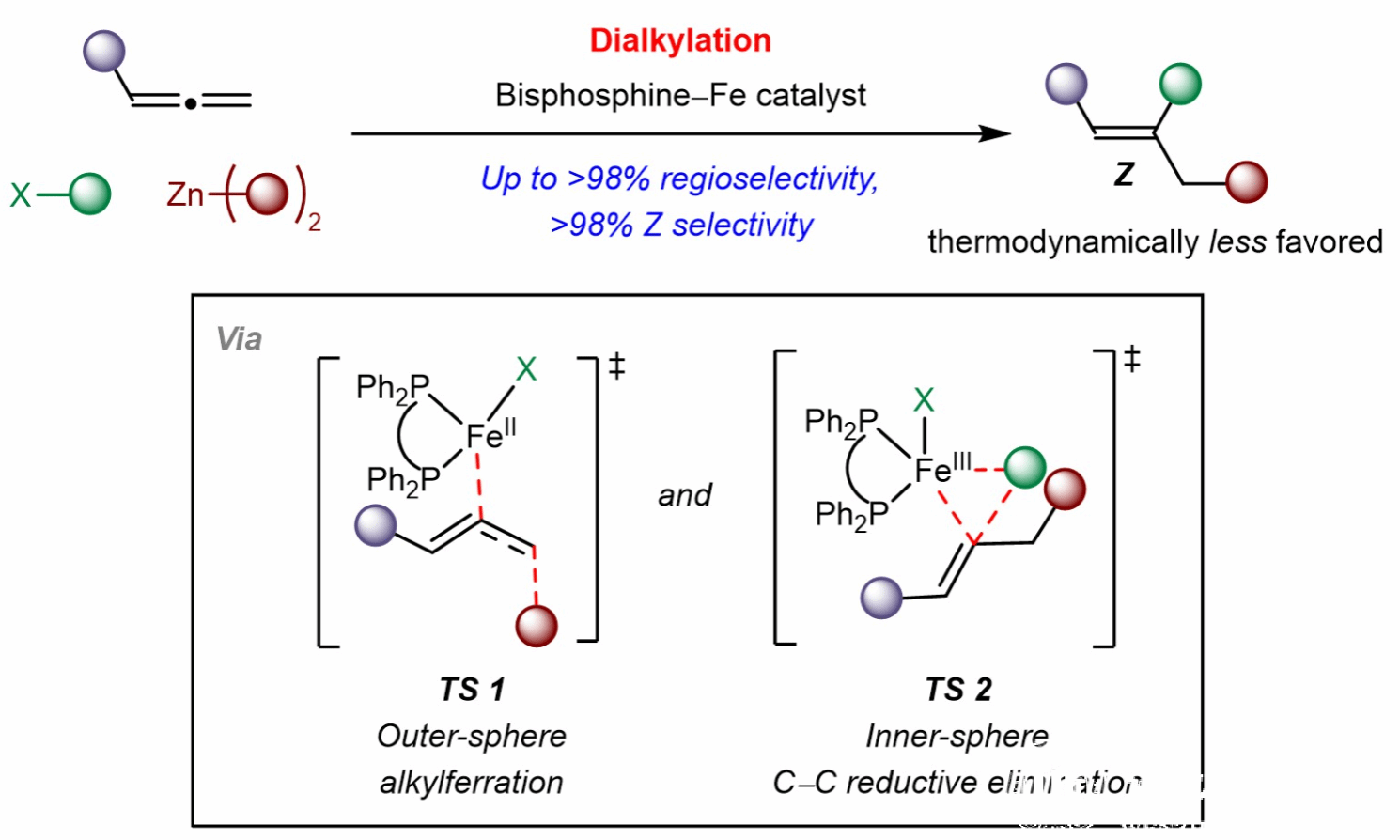 近日,我校钱鹏程教授课题组与新加坡国立大学Ming Joo Koh教授课题组,香港中文大学章兴龙助理教授合作报道了铁催化联烯、二烷基锌化合物和卤代烷烃的多组分反应,以优异的区域选择性和Z-选择性构建了一系列三取代烯烃,包括葡萄糖神经酰胺合成酶(GCS)抑制剂。机理研究表明该反应是由动力学控制的(即自由基介导位阻较小C=C键的铁烷基化和通过还原消除进行的内球烷基化),这与金属催化联烯官能团化反应的传统机制形成鲜明对比。