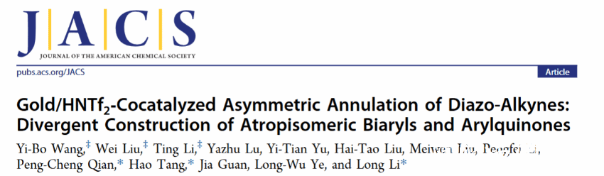 此项工作以Gold/HNTf2-Cocatalyzed Asymmetric Annulation of Diazo-Alkynes: Di-vergent Construction of Atropisomeric Biaryls and Arylquinones为题发表在国际顶级期刊JACS上,万象城手机网页版登录入口作为第一单位,钱鹏程教授,汤浩教授,李龙教授为通讯作者。该研究工作主要由钱鹏程-李龙团队2022级研究生王一波、博士后刘玮、李亭共同完成,并得到课题组其他研究生和本科生协助。理论计算部分由万象城手机网页版登录入口汤浩教授完成。同时南方科技大学李鹏飞教授对我们的工作中绝对构型的测定做出突出贡献。研究工作得到国家自然科学基金(21828102, 22303062, 22401218)、浙江省自然科学基金(LQ23B020002, LY22B030002, LQ22B030004)温州市科技局项目(G20220023),温州市化学会服务站等资助。