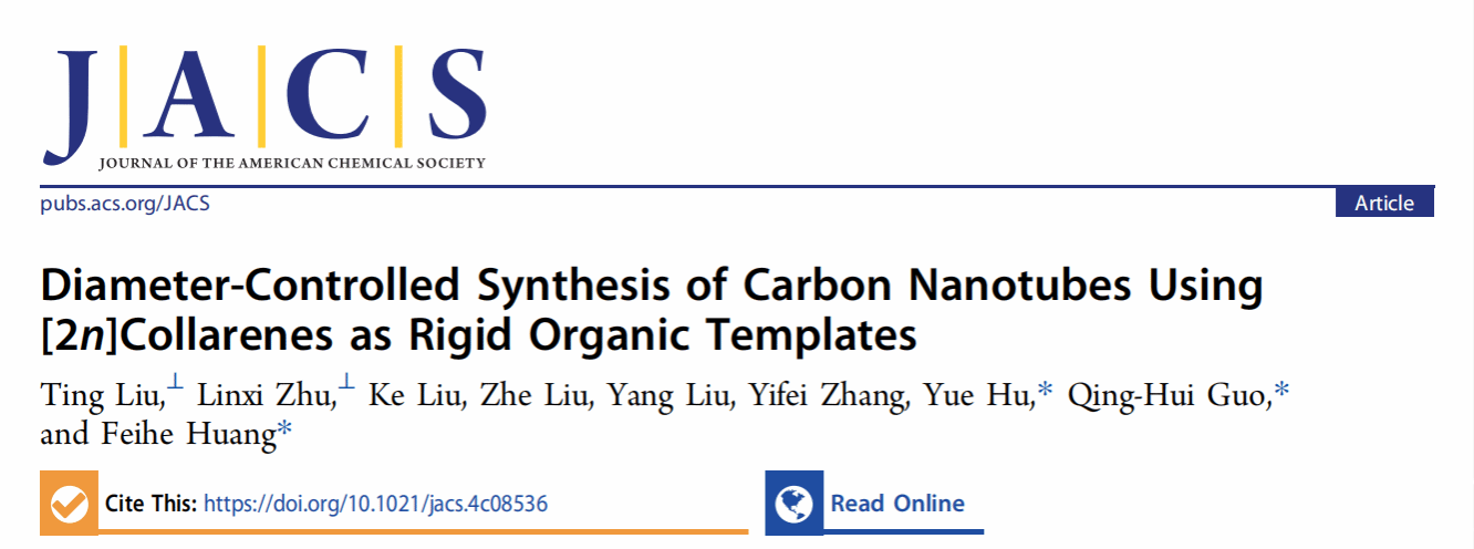单壁碳纳米管(SWCNTs)因其卓越的理化性质而备受关注。碳纳米管的直径对其性质有着重要影响。因此,直径可控地合成SWCNTs对其实际应用至关重要。利用有机分子为模板实现SWCNTs的生长具有重要价值。首先,其结构明确,有利于SWCNTs的直径可控生长。其次,有机模板避免了金属污染问题。在过去十年中,使用有机模板(如CPP和曲面多环芳烃)生长SWCNTs取得了巨大的进展。然而,高效生长窄直径分布的SWCNTs仍然面临挑战。其中最大的阻碍是缺乏合适的模板分子。分子碳纳米带做为碳纳米管的最小重复单元,其刚性结构为SWCNT生长提供精准模板,有利于SWCNT直径可控制备,因此在碳纳米管生长领域引起了广泛关注。然而迄今为止,利用分子碳纳米带为模板实现SWCNTs的直径可控生长仍未被报道。近日,万象城手机网页版登录入口胡悦特聘教授、清华大学郭庆辉副教授、浙江大学黄飞鹤教授合作在该领域实现了突破。