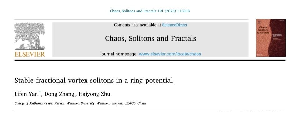 近日,万象城手机网页版登录入口数理学院颜利芬老师在涡旋光孤子领域取得了新进展,相关研究成果“Stable fractional vortex solitons in a ring potential”已在国际著名期刊《Chaos, Solitions & Fractals》(混沌、孤立子与分形)上发表。颜利芬老师是第一作者和通讯作者,该期刊为数学类国际学术期刊,中科院SCI大类一区。