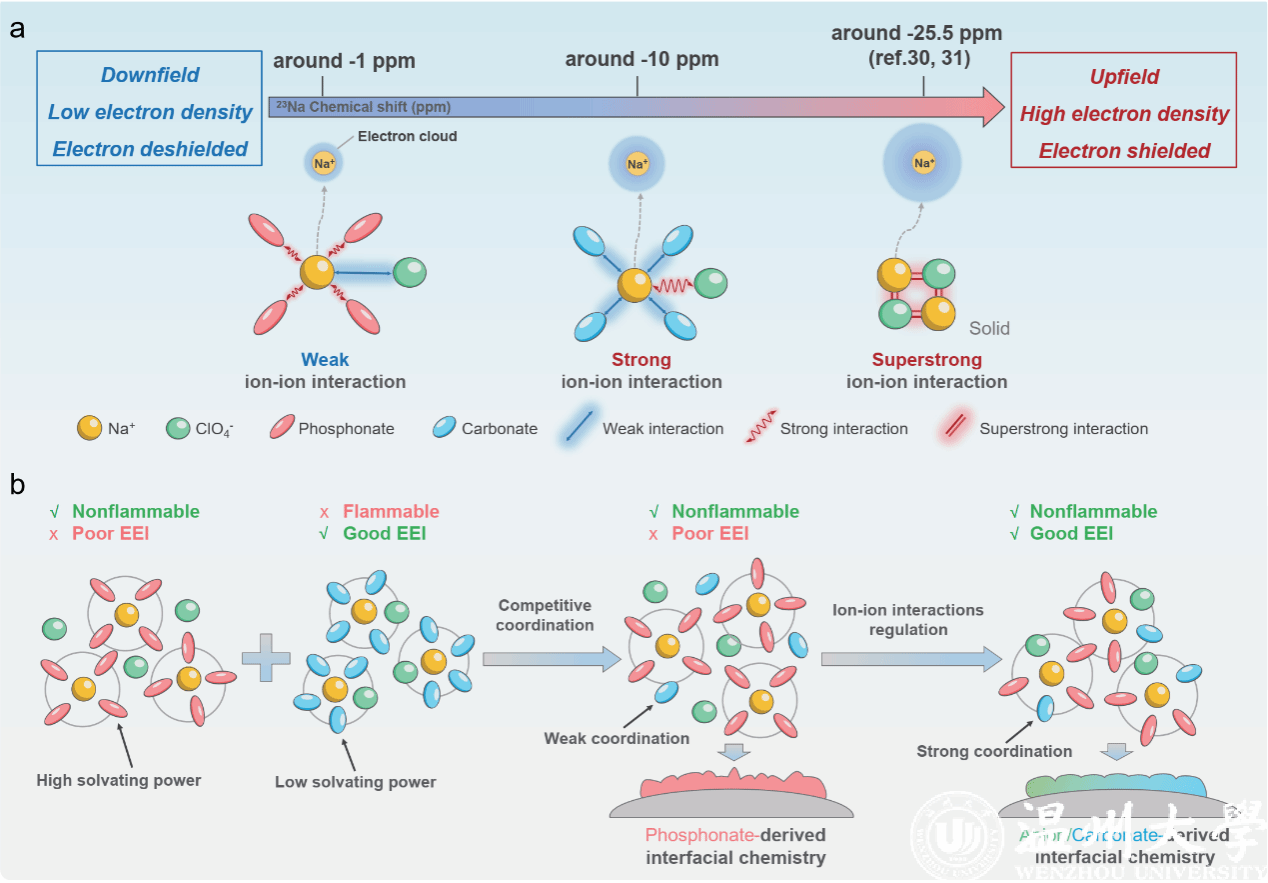 近日我校化材学院李林特聘教授团队联合复旦大学赖伟鸿研究员及上海大学李丽教授在国际权威期刊National Science Review上发表题为《Modulating Ion-Dipole Interactions in Nonflammable Phosphonate-Based Electrolyte for Safe and Stable Sodium-Ion Pouch Cells》的学术论文,这也是我校首次在该期刊上发表论文。在本研究中通过阳离子-阴离子间相互作用的调节以及分子空间位阻的差异,选择性增强低溶剂化能配体分子在Na+溶剂化壳层中的配位数,从而实现有利且可调的界面化学。基于此,作者将一系列低溶剂化能的碳酸酯分子(EC、PC、VC、DEC、EMC)分别引入到高溶剂化能的磷酸酯(TEP)溶剂中,通过增强Na+阳离子与ClO4-阴离子之间的相互作用,选择性的提高了低溶剂化能的碳酸酯分子的竞争配位能力,促使形成富含碳酸酯分子的溶剂化结构,最终构筑了以碳酸酯分子分解为主的稳定界面化学。得益于此,该电解液设计解锁了低溶剂化能分子在溶剂化壳层中较弱竞争配位能力的限制,构建了一种低成本、完全无氟且阻燃的电解液,使得普鲁士蓝||硬碳软包电池在高负载量条件下(正极:20 mg/cm-2;负极:12 mg/cm-2)循环50圈后,仍有高达96%的容量保持率,展示了巨大的实际应用潜力。相关文章发表在National Science Review上,万象城手机网页版登录入口为第一通讯单位,第一作者曾是我院联培生杨卓,目前在复旦大学攻读博士学位,我院侴术雷教授,李林特聘教授以及复旦大学赖伟鸿研究员、上海大学李丽教授为共同通讯作者,相关工作受到国家自然科学基金,浙江省自然科学基金,国家电网科技项目以及温州自然科学基金的资助。