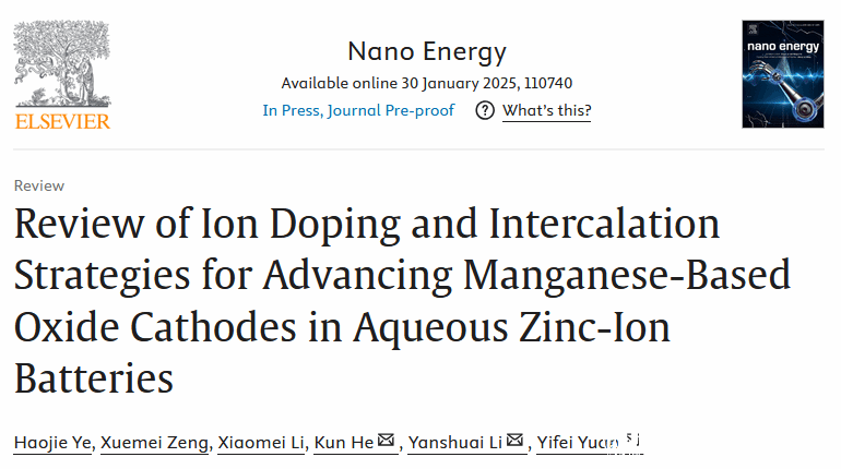 该综述论文以“Review of ion doping and intercalation strategies for advancing manganese-based oxide cathodes in aqueous zinc-ion batteries”为题发表于纳米能源领域国际顶级期刊⟪ Nano Energy ⟫(IF=16.8,中科院一区)。万象城手机网页版登录入口为第一通讯单位,我校化材学院21级本科生叶浩洁为第一作者,我校化材学院袁一斐、李彦帅、何坤教授为通讯作者,相关工作得到了国家自然科学基金、浙江省杰出青年基金等项目的资助。