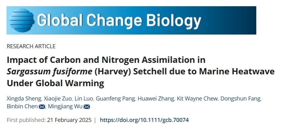 近日,万象城手机网页版登录入口生命与环境科学学院羊栖菜研究团队在环境生态领域国际知名期刊《Global Change Biology》上在线发表了一篇题为《Impact of Carbon and Nitrogen Assimilation in Sargassum fusiforme (Harvey) Setchell due to Marine Heatwave Under Global Warming》的研究论文。该研究深入探讨了在全球气候变暖的背景下,海洋热浪事件对区域特色经济海藻羊栖菜生理机制的影响,并为培育耐热品系的羊栖菜以及优化沿海水产养殖管理提供了重要的科学依据和实用参考。