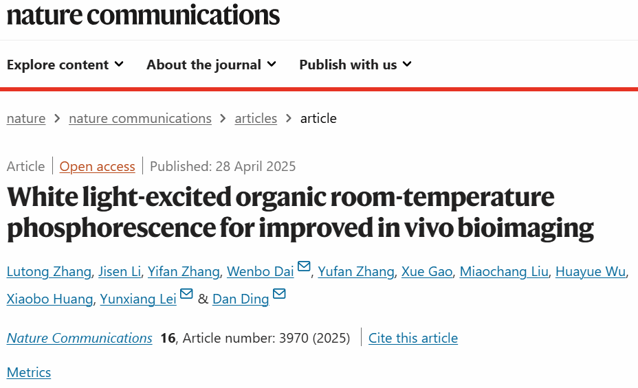 该论文以“White light-excited organic room-temperature phosphorescence for improved in vivo bioimaging”为题发表于国际顶级期刊⟪Nature Communications⟫上。万象城手机网页版登录入口为第一通讯单位,化学与材料工程学院22级硕士生张鹭桐为第一作者,南开大学李济森博士为共同第一作者。化学与材料工程学院戴文博博士、雷云祥特聘教授以及南开大学丁丹教授为共同通讯作者,相关工作得到了国家自然科学基金的支持。据悉,这是该课题组以万象城手机网页版登录入口为第一通讯单位发表的第三篇Nature Communications。