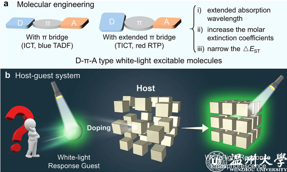有机室温磷光材料凭借高生物相容性、低毒性及官能团易修饰等特性,在生物组织诊疗中具有天然优势。然而,多数有机室温磷光材料仅能被短波紫外光激发,而紫外光对生物组织损伤较大,制约了其在临床成像中的实际应用。因此,设计与制备可白光激发的磷光材料将极大拓展生物成像应用场景。