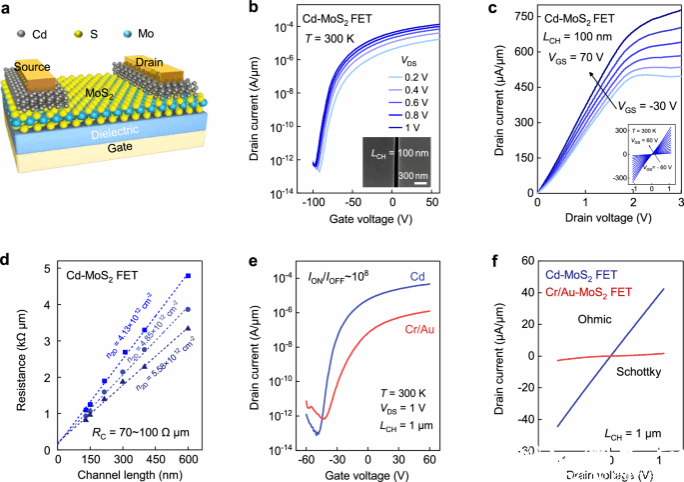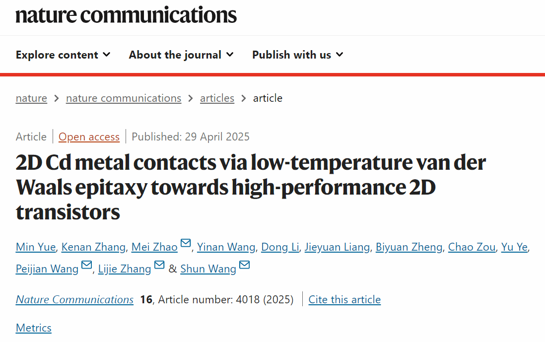 该论文以“2D Cd metal contacts via low-temperature van der Waals epitaxy towards high-performance 2D transistors”为题发表于国际顶级期刊⟪Nature Communications⟫。万象城手机网页版登录入口为第一通讯单位,我院22级硕士生岳敏为第一作者。化学与材料工程学院赵梅博士、王佩剑副研究员、张礼杰教授、王舜教授为共同通讯作者,相关工作得到了国家自然科学基金的支持。