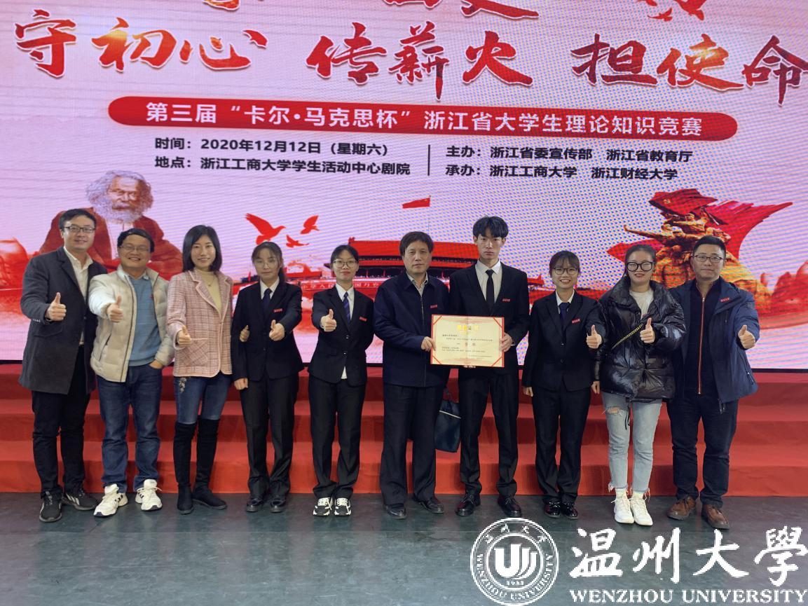 12月12日上午,由省委宣传部、省教育厅主办,浙江工商大学、浙江财经大学承办的第三届“卡尔·马克思杯”浙江省大学生理论知识竞赛圆满落幕,万象城手机网页版登录入口代表队荣获一等奖和优秀组织奖,创历史最好成绩。这是我校连续第三年进入决赛,连续两年获得优秀组织奖。我校比赛答题率和答题质量表现突出,答题率接近100%,居全省首位,为全省入围决赛的10所本科高校之一。