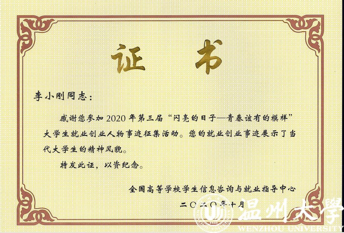 近日,教育部高等学校学生信息咨询与就业指导中心公布了2020年第三届“闪亮的日子——青春该有的模样”大学生就业创业人物事迹征集名单,我校机电工程学院2019届硕士毕业生李小刚成功入选创业人物,浙江省仅5人入选该名单。