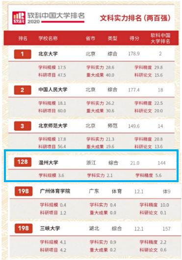 全球领先的高等教育评价机构软科于12月21日发布“2020软科中国大学排名系列:文科实力排名”,我校在文科实力榜单中排名全国第128位、浙江省第8位(含浙江大学),展示了我校文科综合实力在浙江省乃至全国的位置。