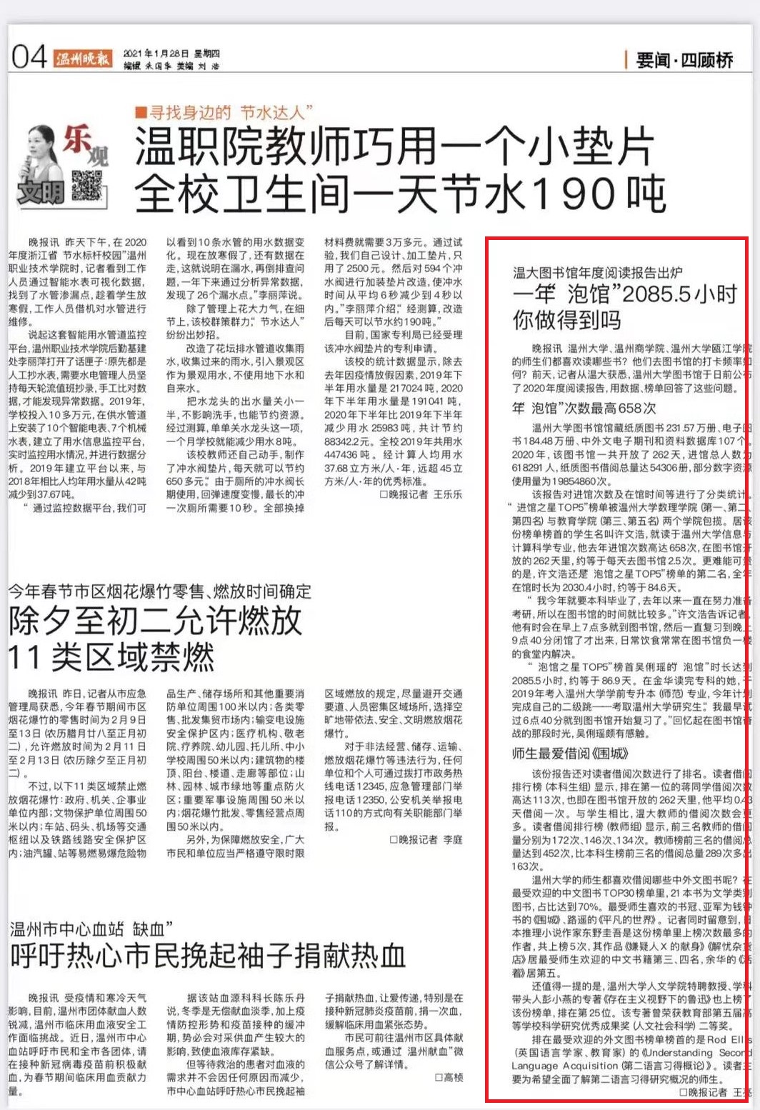 万象城手机网页版登录入口的师生们都喜欢读哪些书?他们去图书馆的打卡频率如何?前天,记者从温大获悉,万象城手机网页版登录入口图书馆于日前公布了2020年度阅读报告,用数据、榜单回答了这些问题。