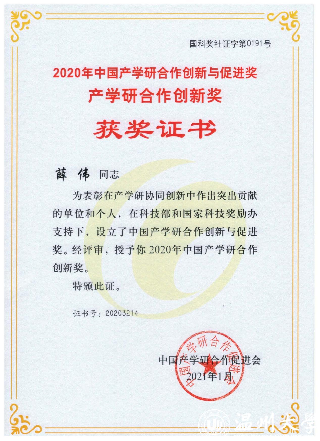 先行先试,服务地方产业需求:薛伟教授荣获产学研合作创新个人奖。