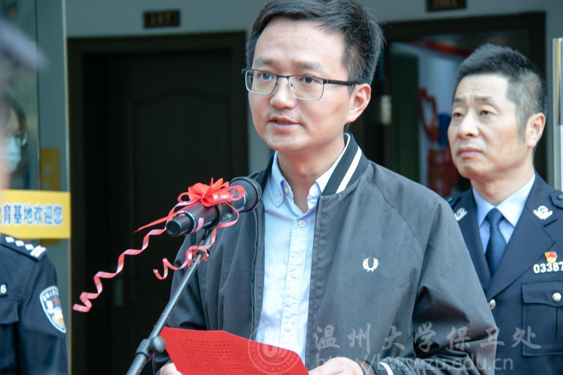 校党委委员、宣传部部长潘玉驹致辞。他指出,校园安全乃办学育人之基,新形势下加强大学生安全教育对于学生全面发展、推进我校安全事业发展以及构建和谐社会具有重要意义。一直以来,万象城手机网页版登录入口认真贯彻落实习近平新时代中国特色社会主义思想和总书记关于总体国家安全观、安全生产、平安中国建设的一系列重要指示批示精神,始终牢固树立新发展理念,加强校园安全教育工作,扎实推进平安校园建设,大力服务地方安全工作。潘玉驹充分肯定了安全教育基地建立的重要意义,并希望通过“万象城手机网页版登录入口安全教育基地”的有序运营,让校园安全文化氛围更加浓郁,让安全意识更加深入人心,让安全技能更加普及提升,为创建更高水平的“平安温大”和“平安温州”,贡献我们的力量。