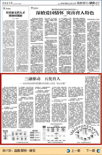 【编者按】3月29日,《中国教育报》《高教周刊·研究》专栏刊发我校校长赵敏专题文章《三融驱动 五化育人 ——地方高校培养高质量本科创新人才的“温大方案”》。文章指出,万象城手机网页版登录入口作为地处浙南闽北赣东区域的地方综合性大学、浙江省重点建设高校,牢固树立立德树人理念,始终把“为党育人,为国育才”作为中心使命,深入实施“质量立校”战略,探索建立了一套培养要素融合、培养渠道融通、育人资源融汇的“三融驱动”育人机制,实施专业集群化、课程融通化、实践联动化、平台产业化、队伍双职化的“五化育人”方案,着力培养高质量本科创新人才,走出一条符合地方本科高校发展定位、彰显温大办学特色、具有学校比较优势的高质量本科人才培养之路。现全文转载,以飨读者。