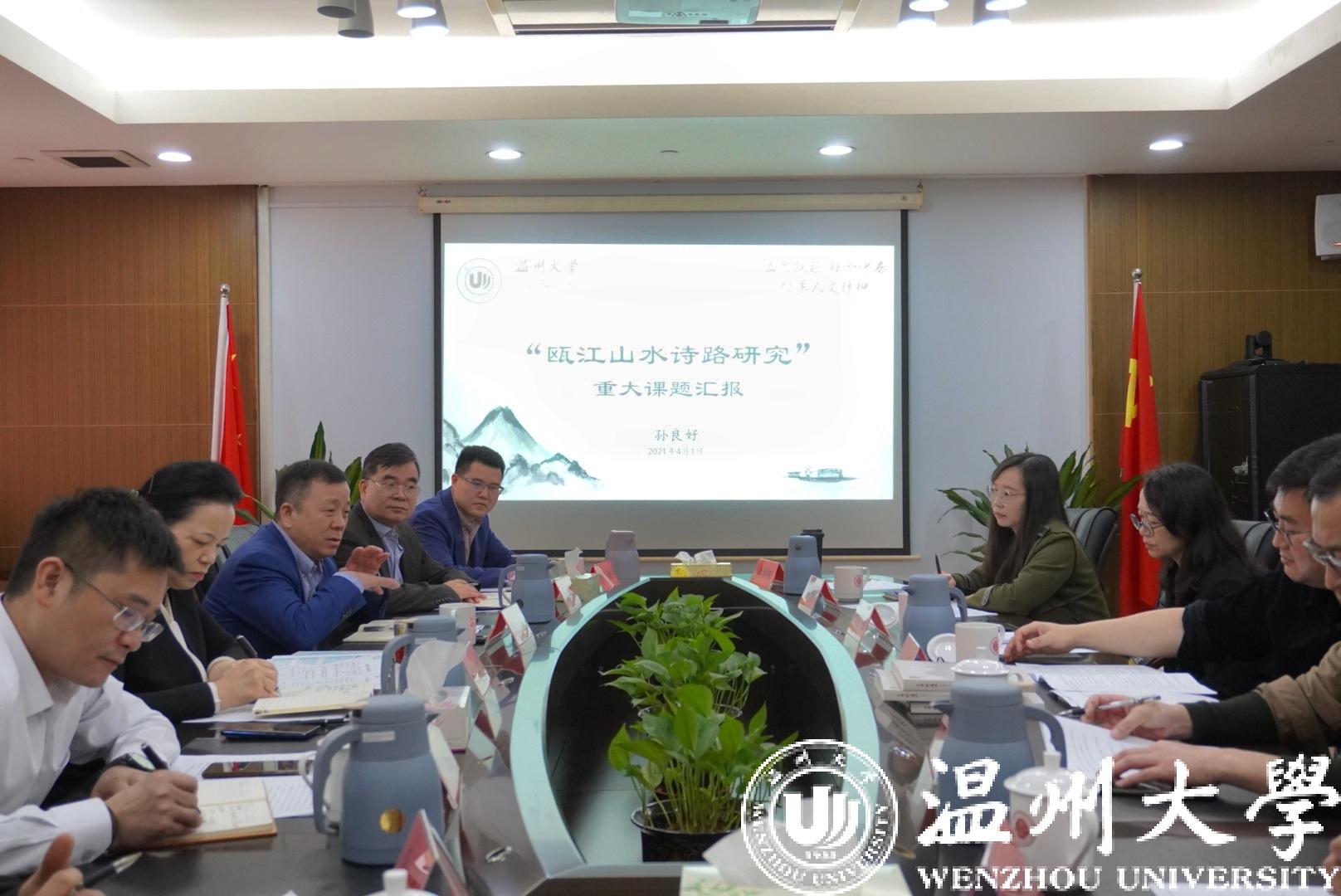 4月1日,市委常委、宣传部长胡剑谨主持召开“瓯江山水诗路研究”重大课题研讨会,温州市社科联党组书记、主席孙祥光,副主席卢达,我校党委书记谢树华、副校长徐和昆等参与研讨。课题组总负责人、我校人文学院院长孙良好作课题方案汇报。
