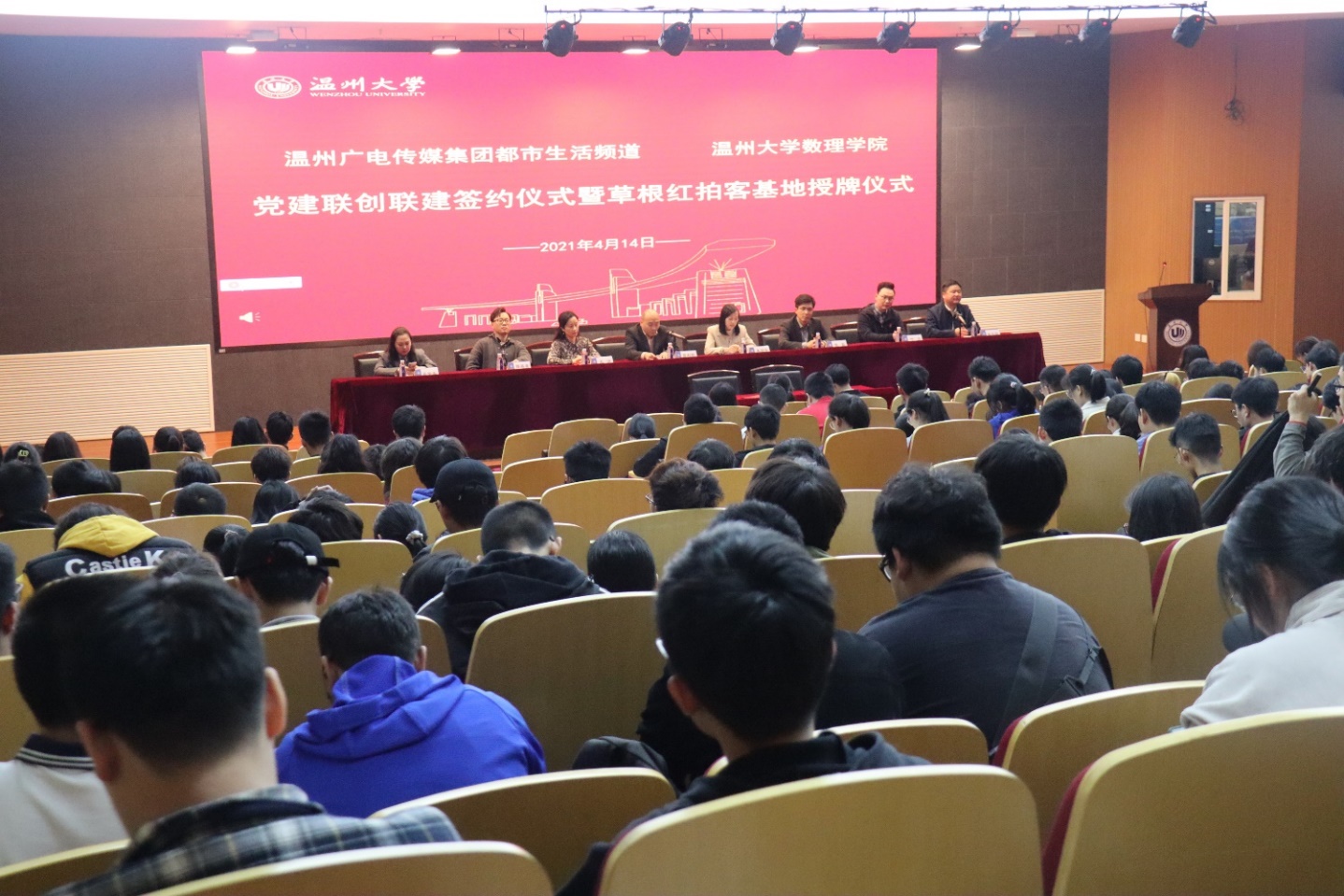 签约仪式后,双方党支部举行《草根红拍客》基地授牌仪式。据介绍,温大数理学院为我市第八家、高校首家《草根红拍客》基地。随后,《草根红拍客》栏目编导陈品熹开设了《融媒体时代如何成为一名优秀的拍客》专题讲座,指导温大数理学院师生利用手机工具讲好温州“数学家之乡”的故事。