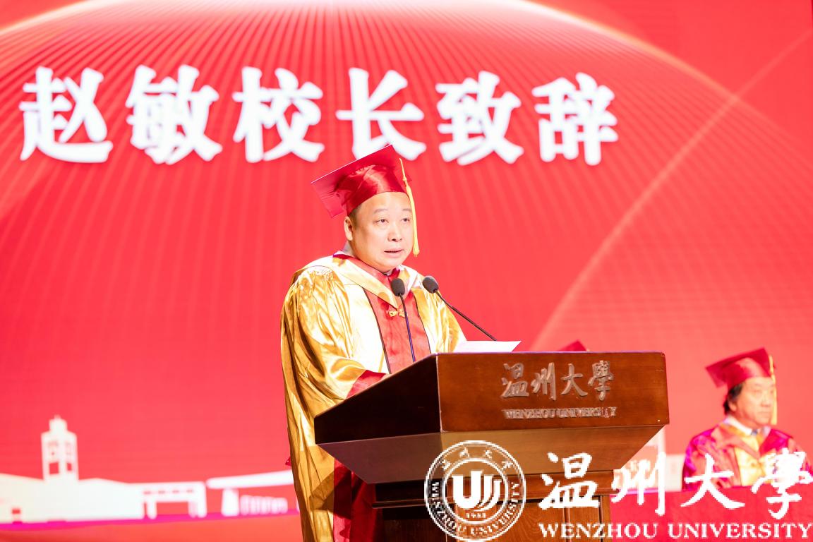 赵敏校长致辞。“今天的你们,羽翼飞扬、华丽蜕变,收获了属于自己的光荣与梦想。”面对大学期间收获满满的毕业生们,赵敏校长感到由衷的欣慰和骄傲。在毕业生们即将开启新征程、奔赴新生活的难忘时刻,校长围绕“初心”二字娓娓道出对毕业生的希冀。“永葆初心,就是坚持追逐理想的真心,始终坚定前行的脚步,活出真实而清醒的自我;永葆初心,就是坚守勤勉实干的恒心,在各自领域钻研深究,绽放绚丽多彩的青春之花;永葆初心,就是坚定为国为家的决心,让追求和时代同频共振,闪耀灿烂夺目的青春之光。”最后,赵敏校长向毕业生们送上了诚挚的祝福,“衷心祝愿同学们坚守初心,勇敢向未来出发,一路风景、一路芳华!”