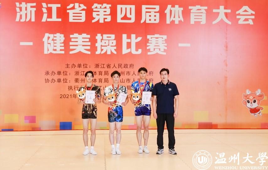 我校健美操教练方仕玮老师夺得含金量最高的成年组男子单人操冠军、20级研究生李知洋协同队友夺得成人组自编八人徒手操冠军,为我市代表队本次参赛获得的所有金牌。温州市位列全省金牌榜第二位。