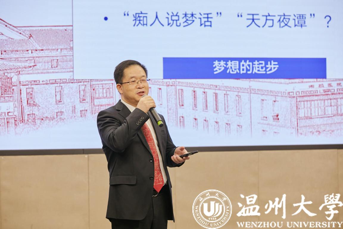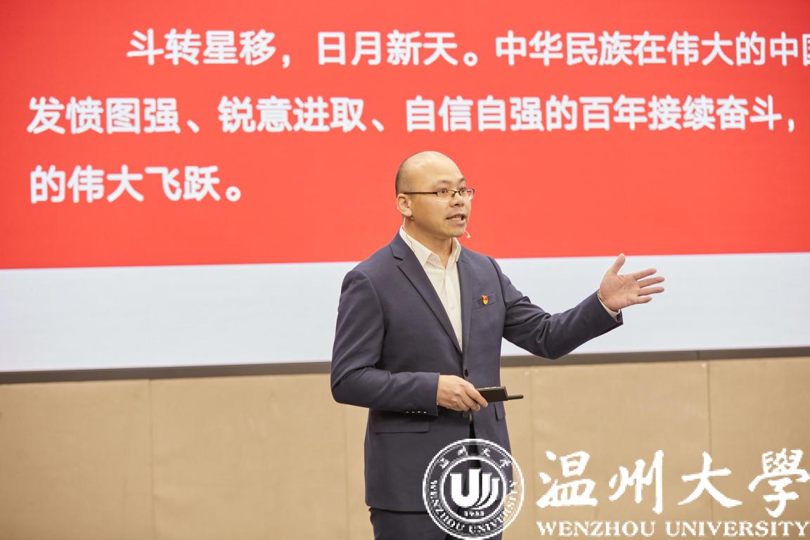 思政公开课在庄严的国歌声中拉开了序幕,校党委书记谢树华致辞。谢树华感谢市委宣传部创新搭建全市高校“思政公开课”平台,让广大青年学子有缘线上线下相聚在美丽的万象城手机网页版登录入口,共学思政大课、共悟时代思想、共话美好未来。谢树华指出,万象城手机网页版登录入口历来高度重视大学生思政教育工作,具有思政教育的优良传统和丰硕成果,此次活动选择在万象城手机网页版登录入口举办,既是对温大思政工作的一种肯定和支持,也是对温大的一种莫大鼓舞和巨大鞭策。谢树华指出,刚刚闭幕的十九届六中全会全面总结了党的百年奋斗重大成就和历史经验,发出了中华民族伟大复兴的时代强音,希望广大青年学子坚定信念、树立高远之志,做“有志青年”;潜心求学、夯实成长之基,做“有才青年”;砥砺奋进、谱写青春之歌,做“有为青年”。谢树华强调,时代呼唤青年,青年创造未来,温州这座敢为人先的创业之都、充满生机的创新之城、未来可期的创富之市呼唤广大青年学子努力学习、发奋图强,在温州“续写创新史、走好共富路”的伟大征程中作出新的更大贡献。