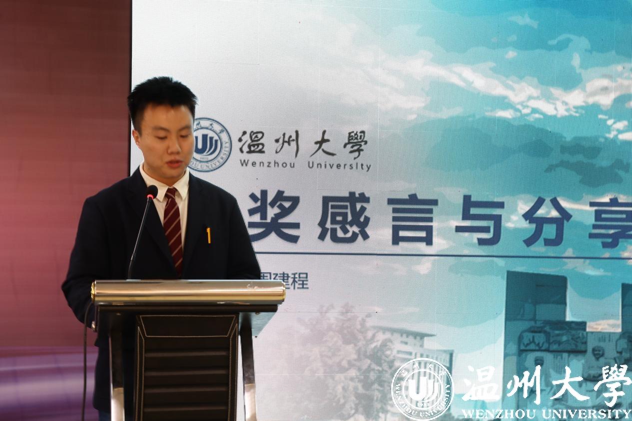 颁奖典礼上,温州市教育局高等教育处处长吕信恩、温州市人社局就业创业管理服务中心副主任张萍萍等为获奖代表颁奖,我校电气与电子工程学院20级硕士研究生周建程代表入选的创新创业典型人物做优秀事迹分享。