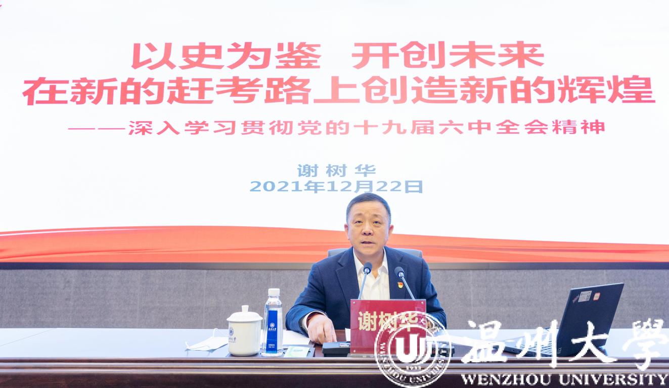 谢树华围绕1.2.3.4.5.10六组数字深刻解读十九届六中全会精神,并就如何以六中全会精神为指导推动学校高质量发展与师生分享体会。