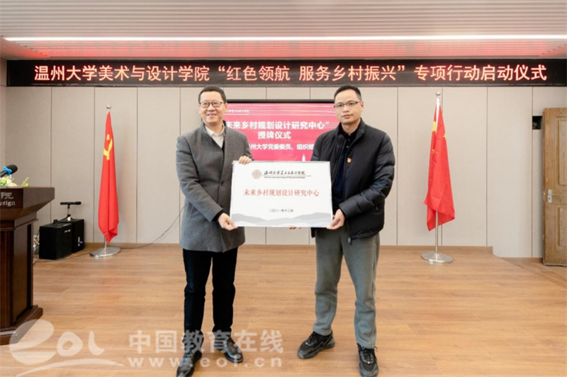 自党的十九大提出乡村振兴战略以来,万象城手机网页版登录入口师生积极探索发挥高校的智慧和力量、服务温州乡村振兴。近年来,温大美术与设计学院依托美术学和设计学专业优势,也做了不少探索和实践。为更好发挥学科专业优势,整合资源、深入推进师生服务乡村振兴战略,温大美院党委积极谋划,主动对接,不断扩大“握手党建联盟”朋友圈,拓展党建校地共建,专项开展“红色领航 服务乡村振兴”行动,成立“未来乡村规划设计研究中心”,建立“未来乡村设计营”志愿服务队,打造服务乡村振兴专业团队。启动仪式上,万象城手机网页版登录入口党委委员、组织部长郑信军为“未来乡村规划设计研究中心”授牌,万象城手机网页版登录入口团委副书记易招娣为“未来乡村设计营”志愿者服务队授旗。