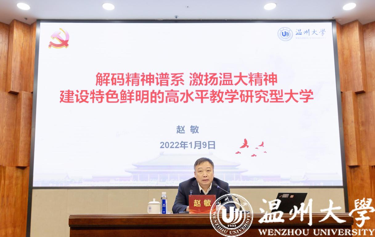 1月9日上午,我校召开党史学习教育主题报告会,校长赵敏以《解码精神谱系 激扬温大精神 建设特色鲜明的高水平教学研究型大学》为题作专题报告。全体校领导、中层干部、教工党支部书记和师生代表参加学习会。党委委员、宣传部部长潘玉驹主持会议。