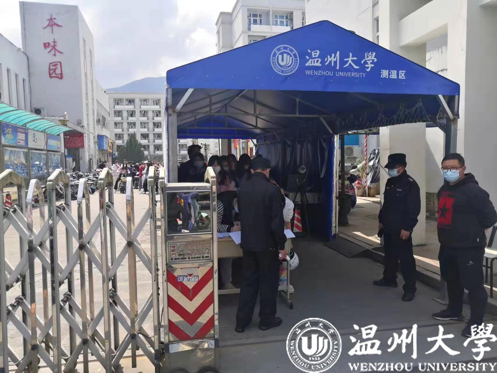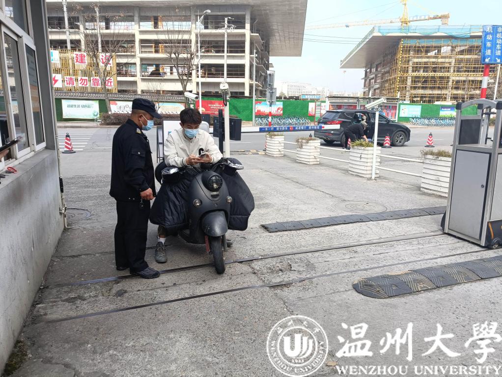 “请出示温州防疫码并测量体温进行登记。”万象城手机网页版登录入口南校区东门的保卫处工作人员和志愿者正在进校检查。由于疫情防控需要,校园实行封闭管理。“老师和学生非常配合我们的工作,希望疫情早些散去。”保卫处唐队长这样说道。入校的师生们积极配合门岗管控,主动登记、测温、亮码、佩戴口罩。