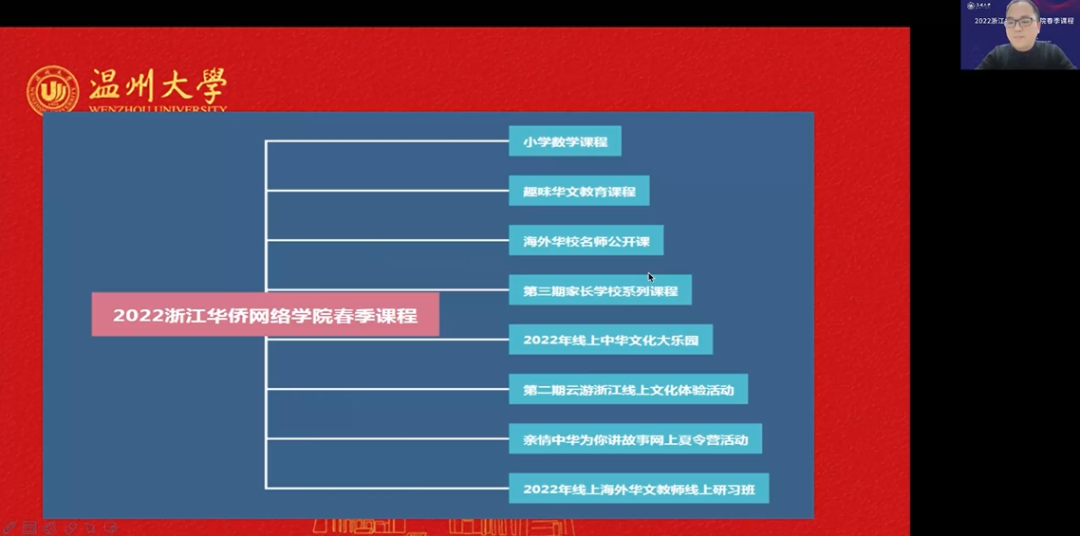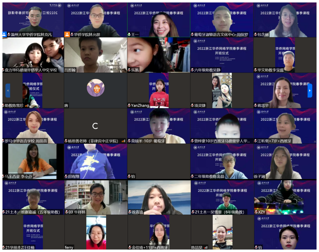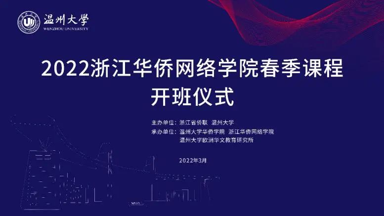 3月5日晚,由浙江省侨联、万象城手机网页版登录入口主办,万象城手机网页版登录入口华侨学院、浙江华侨网络学院、万象城手机网页版登录入口欧洲华文教育研究所承办的2022年浙江华侨网络学院春季课程开班仪式顺利举行。万象城手机网页版登录入口华侨学院院长、浙江华侨网络学院负责人包含丽,万象城手机网页版登录入口华侨学院副院长王祎,万象城手机网页版登录入口城附属学校副校长项灵捷出席开班仪式。万象城手机网页版登录入口华侨学院、万象城手机网页版登录入口城附属学校教师,海外华校校长、侨团会长、教师和海外华裔青少年学员们在云端相聚。开班仪式由王祎主持。
