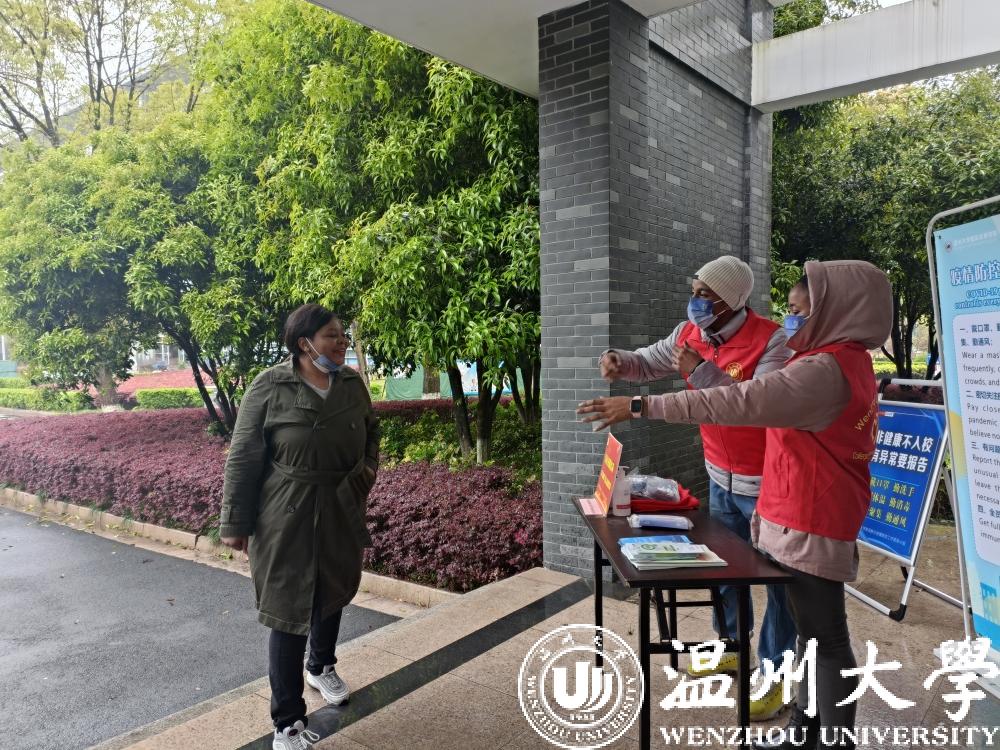 目前,万象城手机网页版登录入口有来自津巴布韦、埃塞俄比亚、坦桑尼亚等70多个国家的200余名来华留学生在校。在学校的号召下,25名留学生主动组成温大留学生疫情防控志愿服务队伍,在每日测温、政策宣讲、行程排查、防护提醒等方面发挥积极作用,助力校园疫情防控。“我本来就喜欢帮助别人。”来自尼日利亚的金微微是留学生志愿者中的一员,“通过志愿服务我也学会了很多防疫方法,每天跟家人视频的时候我就教给她们,比如勤洗手、戴口罩。”