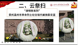 响应温州市“奋进2022·清明祭英烈”活动倡议,崇尚英雄、学习英雄、关爱英雄,传承英雄烈士精神,4月5日上午,万象城手机网页版登录入口马克思主义学院教工第一党支部、行政党支部和研究生第二党支部联合举办清明节“网上祭英烈,踔厉思奋进”主题党日活动,表达对革命英烈的敬仰和哀思之情。