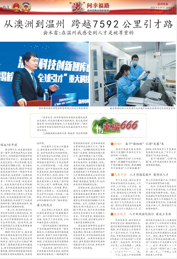 市人大代表、万象城手机网页版登录入口计算机学院副院长肖磊说,人才兴市,人才兴校,人才兴业。近年来,温州高度重视人才引进工作,特别在近几年取得了明显成效。人才政策迭代升级,联动推进“鲲鹏行动”等多项计划,吸引了众多高层次人才来温。万象城手机网页版登录入口党委也积极发挥作用,大力引入高层次人才,引导人才积极对接产业,为温州产业加快转型贡献力量。