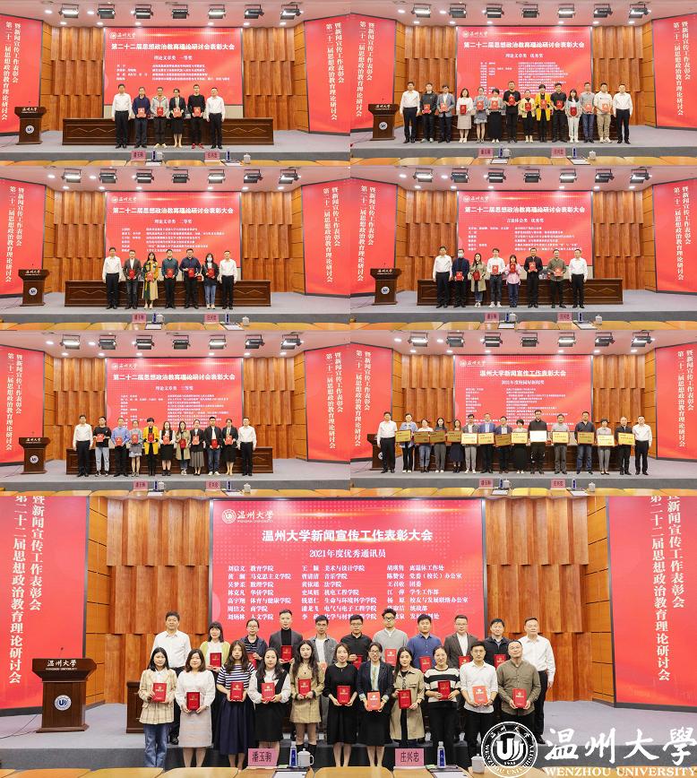 2021年,我校紧紧围绕新时代新思想新理念新要求,就学校新闻与宣传思想文化工作开展了广泛的理论研究和实践探索,唱响温大好声音,汇聚发展正能量,校园相关工作再上新台阶。会上,潘玉驹宣读了学校第二十二届思想政治教育理论研讨会优秀论文获奖者、2021年度校园好新闻获奖单位、校优秀通讯员以及全省校报好新闻获奖者等名单。会议对获奖单位和个人进行了表彰颁奖。