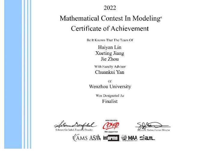 特别是由数理学院林海燕、计算机与人工智能学院蒋雪婷以及机电工程学院周洁三位同学组成的参赛团队,在指导师、数理学院严传魁老师的指导下,经过激烈的层层角逐,从全世界近3万组选手中脱颖而出,喜获特等奖提名奖(简称F奖),为我校实现该赛事的突破作出了积极贡献。