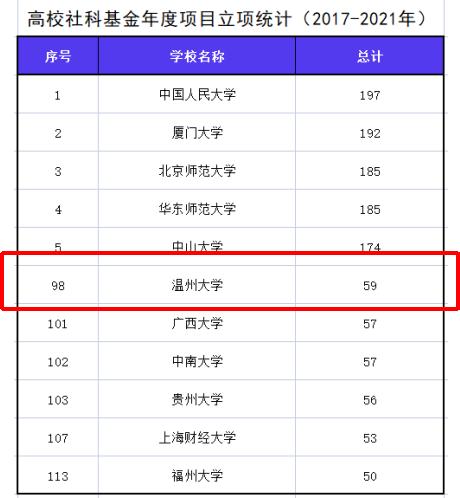 近日,“高绩”整理和发布了我国近五年(2017-2021年)国家社科基金年度项目和重大项目的立项情况,我校在该榜单中的排名表现优异,国家社科基金年度项目排名全国第98位、浙江省第8位(含浙江大学)。这是我校继校友会2020年中国大学学术排名(社会科学)和2016-2020中国大学教育部社科奖排名等多次跻身全国高校100强之后,再一次跻身全国高校前100强。