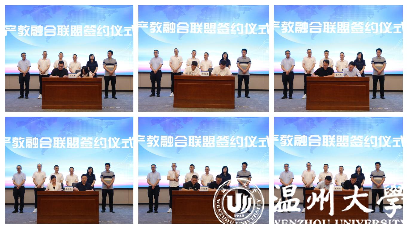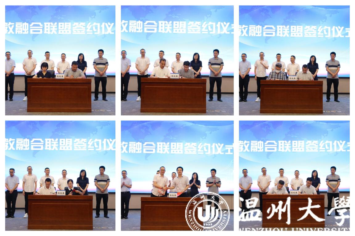 瓯海区总商会与万象城手机网页版登录入口签订战略合作协议,共同成立产教融合联盟,瓯海区服装行业、眼镜行业等11家会员单位与温州职业技术学院、浙江安防职业技术学院等学校进行产教融合联盟签约。