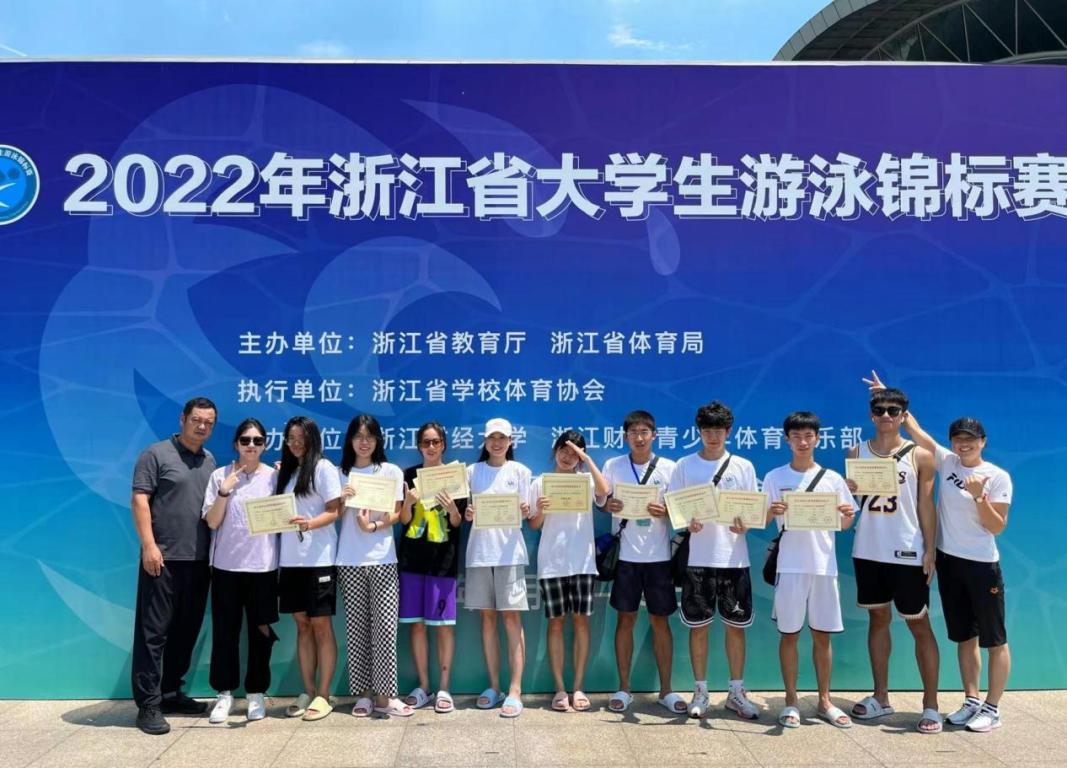近日,2022年浙江省大学生游泳锦标赛在浙江财经大学下沙校区顺利闭幕。来自全省48所高校的542名运动员参加比赛。本次比赛分为甲、乙、丙、丁四个组别,共设置自由泳、仰泳、蛙泳、蝶泳、混合泳、接力、男女混合接力等男子、女子项目各17项。我校游泳健儿劈波斩浪,勇夺甲组两枚金牌、丙组一枚银牌等共17个奖项。