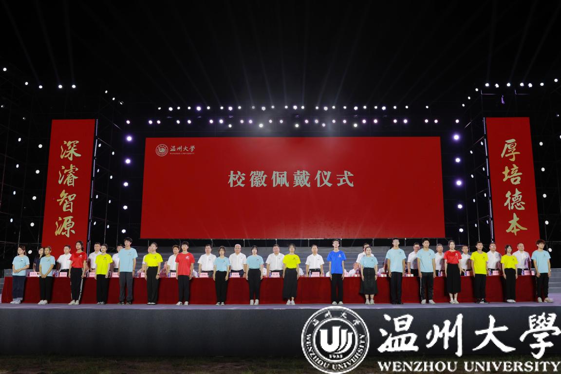 校领导为新生代表佩戴万象城手机网页版登录入口校徽。一枚小小的校徽承载着学校89载历史底蕴和厚重情怀。从这一刻起,“温大人”成为2022级新同学一生的印记。新“温大人”肩上担起了温大责任,心中延续着温大精神,走上了与校共荣的道路。