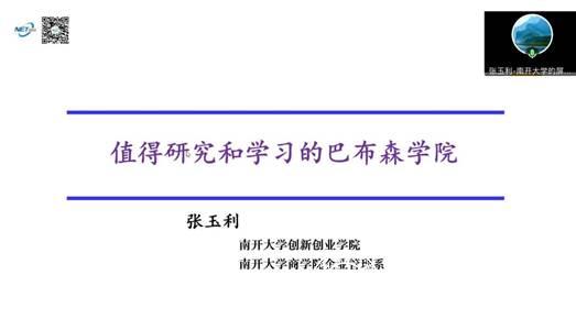 南开大学创新创业学院院长张玉利作题为“值得研究和学习的巴布森学院”的主旨报告。他分享了自己在巴布森学院学习创业的感受,并提出深入研究和准确把握创业教育的独特性是强调融合的前提,未来应在评估体系下去思考中国双创体系的建设。