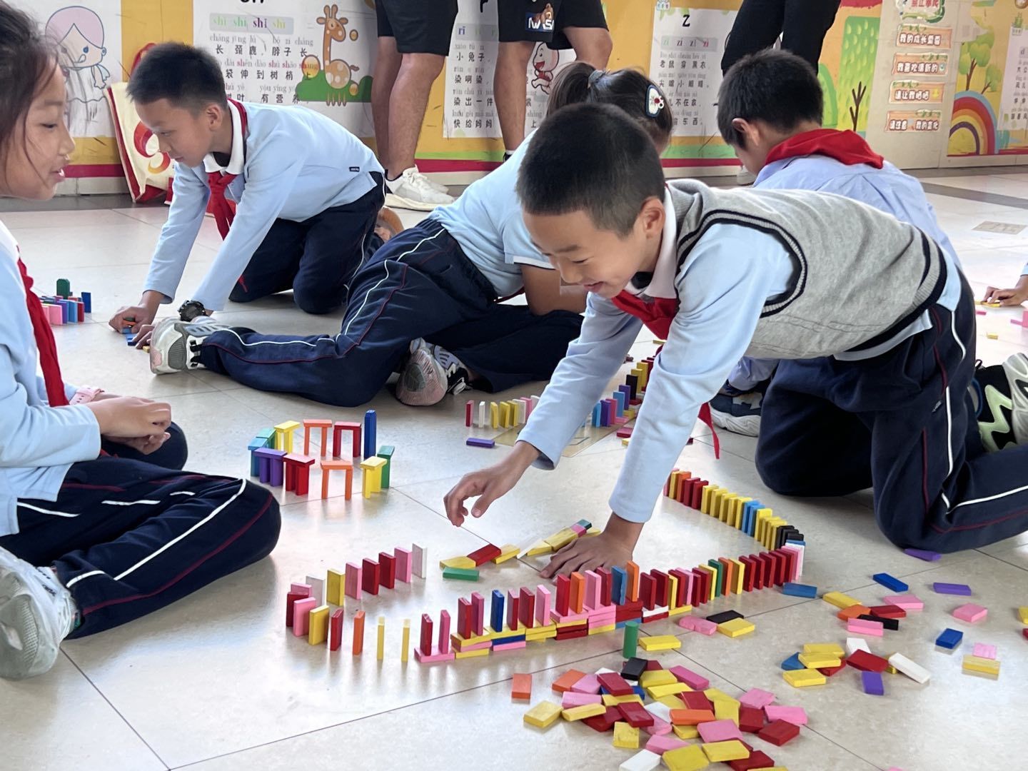 小学生在公益课堂上叠多米诺骨牌