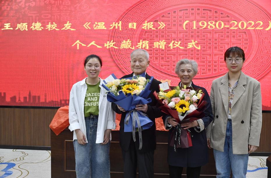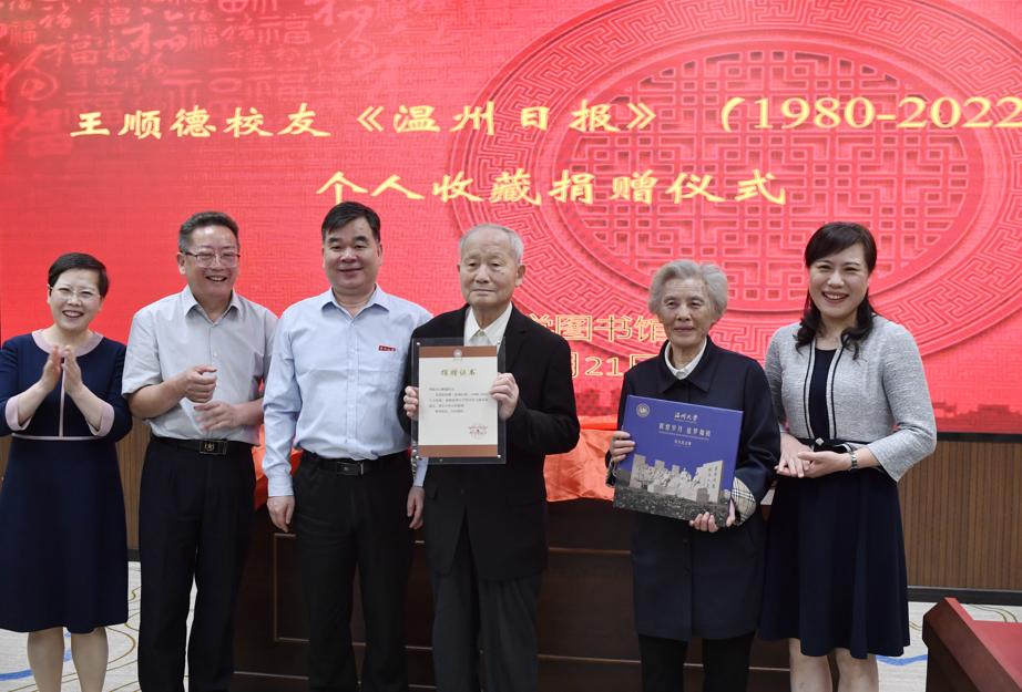 捐赠现场,温大为王顺德颁发图书馆捐赠证书和校友总会证书。“很感动!”温大图书馆副馆长周志峰表示,王顺德老先生成体系收藏报纸在温州特别罕见,他捐赠的报纸将纳入温大地方文献中心,成为珍贵的资料供在校师生查阅。